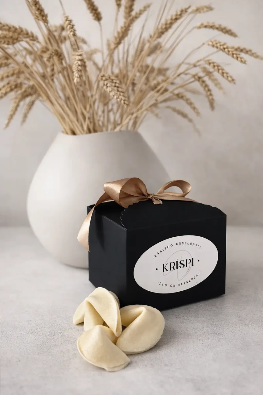 Kinkekarbis 10 käsitöö õnneküpsist. Iga küpsis peidab motiveeriva, inspireeriva või julgustava sõnumi toidukindlal sedelil. Elegantne karp siidipaberi ja lindiga – kohe kingiks valmis.