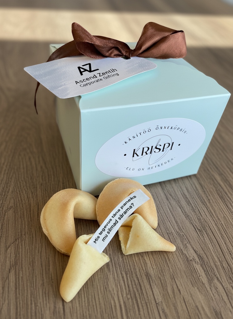 10 käsitöö õnneküpsist kinkekarbis või üksikuna. Toidukindel sedel sinu sõnumiga, elegantne pakend ja kaart – kohe kingiks valmis